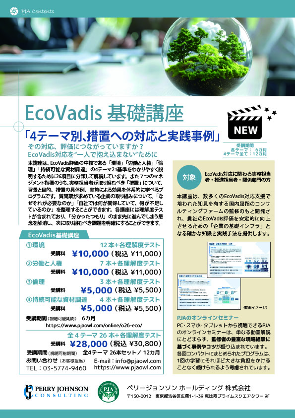 | コース内容 | EcoVadis評価の中核である4テーマ21基準の「措置」について、背景と目的、措置の具体例、実施による効果を体系的に学べる26本のプログラムです。